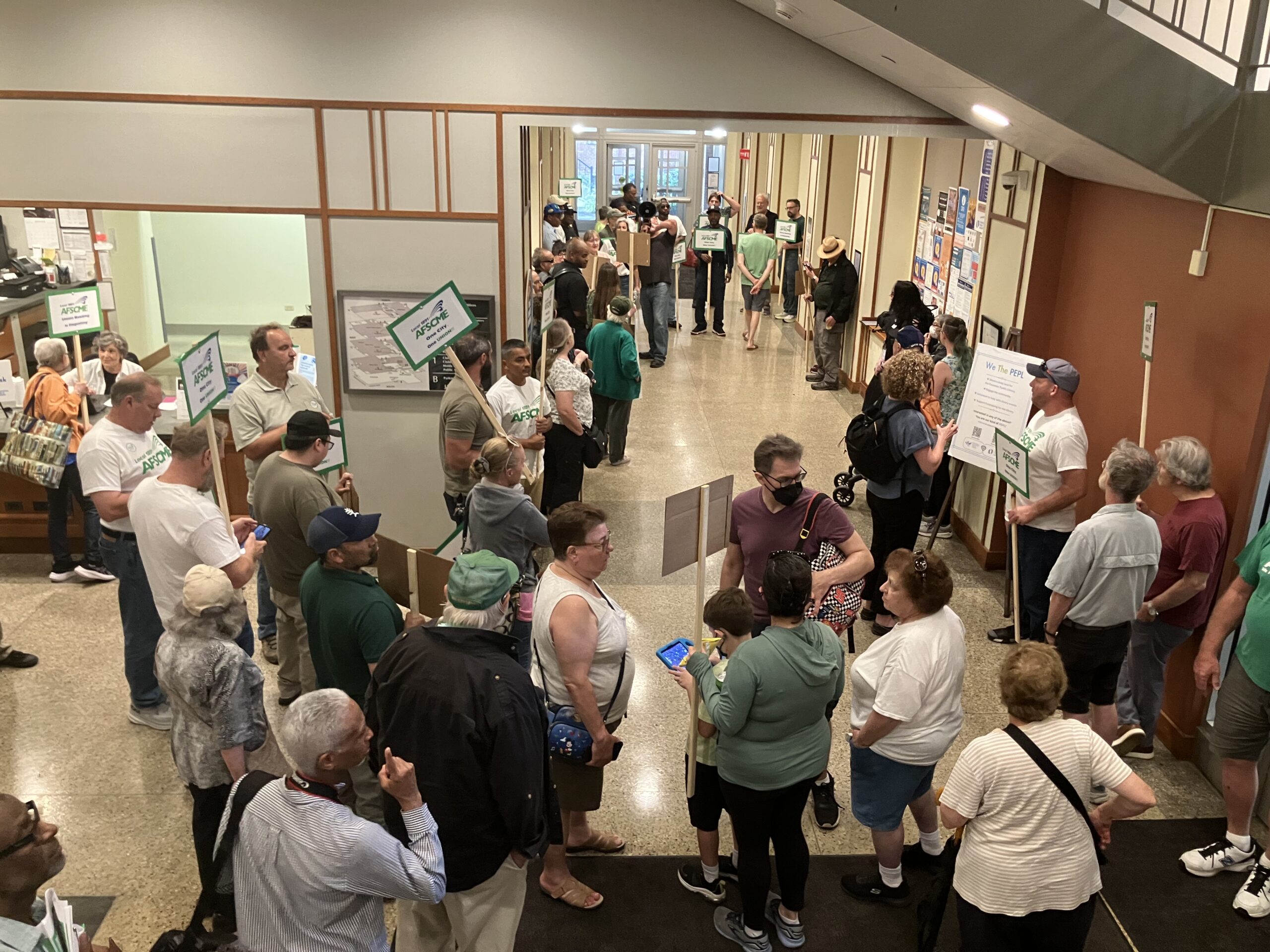 AFSDME workers collect in the lobby of the main public library, waiting to go in to address the Board.